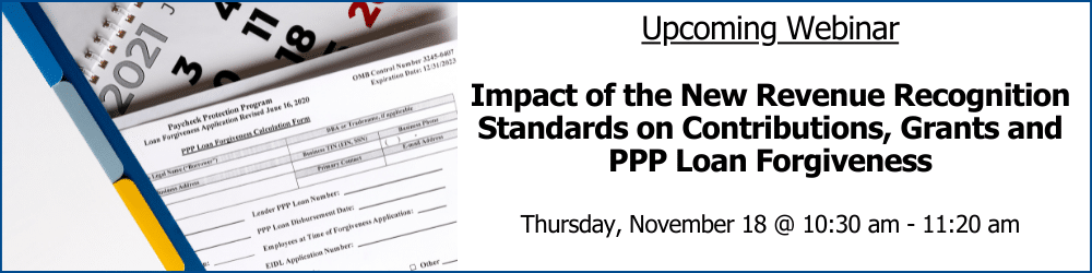 Julia Lafferty, partner and director of CBM’s not-for-profit group, and Anthony Cuozzo, senior advisor, are scheduled to present on the “Impact of the New Revenue Recognition Standards on Contributions, Grants and Paycheck Protection Program Loan Forgiveness”. Their session is scheduled virtually for the Greater Washington Society of CPAs’ Nonprofit Symposium, on Thursday, November 18 from 10:30 am to 11:20 am. Their presentation will include a review of the new revenue recognition standard, the new contribution standard for not-for-profit organizations (including the criteria for recording a conditional contribution) and conditions for recording forgiveness of a PPP loan. Julia and Anthony will also discuss how an exchange transaction differs from a contribution and the definition of “commensurate value”.